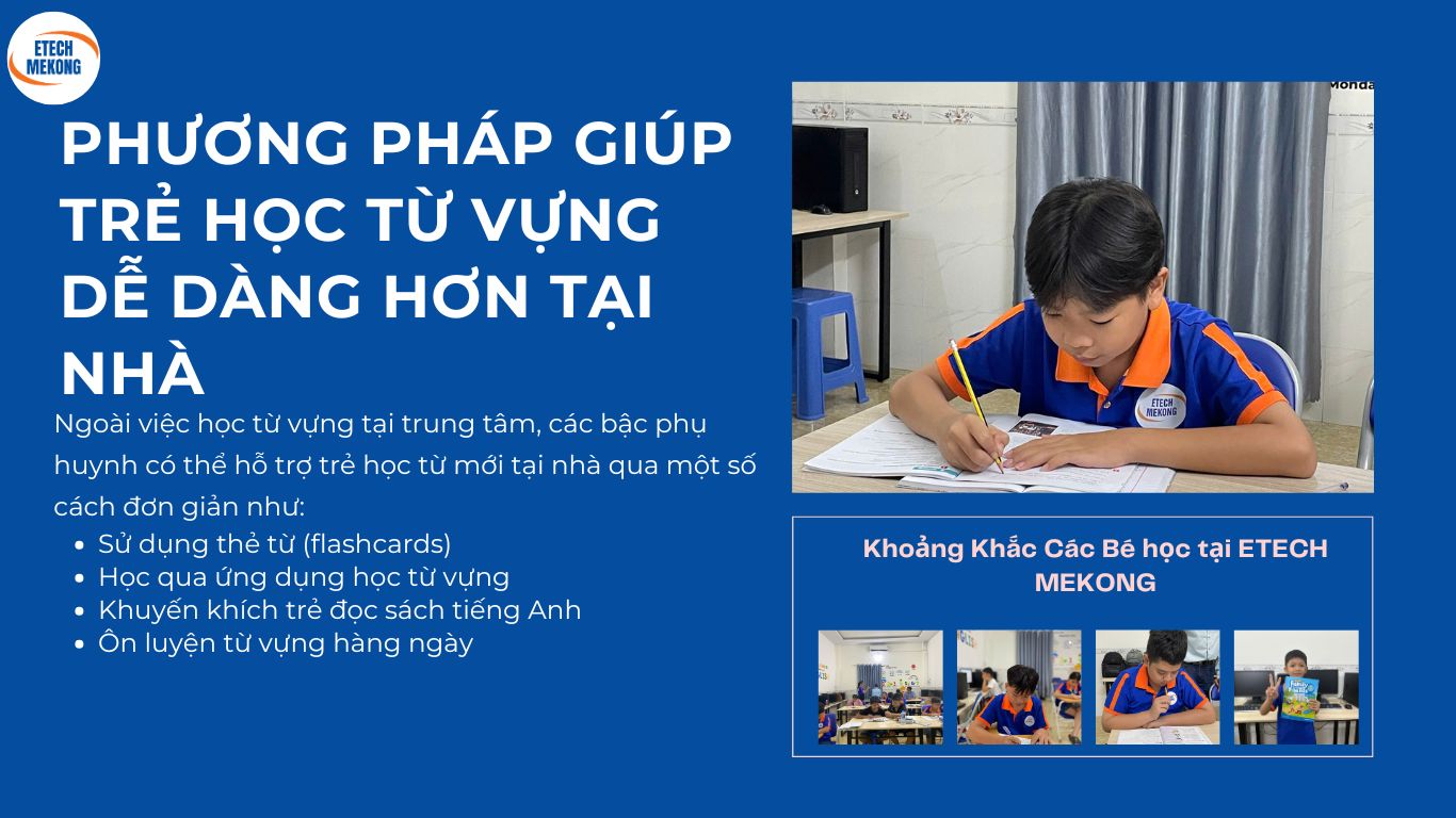 Trong quá trình học tiếng Anh, từ vựng đóng vai trò rất quan trọng. Nó giúp trẻ xây dựng nền tảng ngôn ngữ vững chắc. Tuy nhiên, học từ vựng đòi hỏi phương pháp hiệu quả và phù hợp. Tại ETECH MEKONG, chương trình học từ vựng được thiết kế phong phú và sinh động. Trẻ có thể tiếp thu từ mới một cách tự nhiên và hứng thú. Bài viết này sẽ giới thiệu lợi ích và phương pháp học từ vựng tại trung tâm.