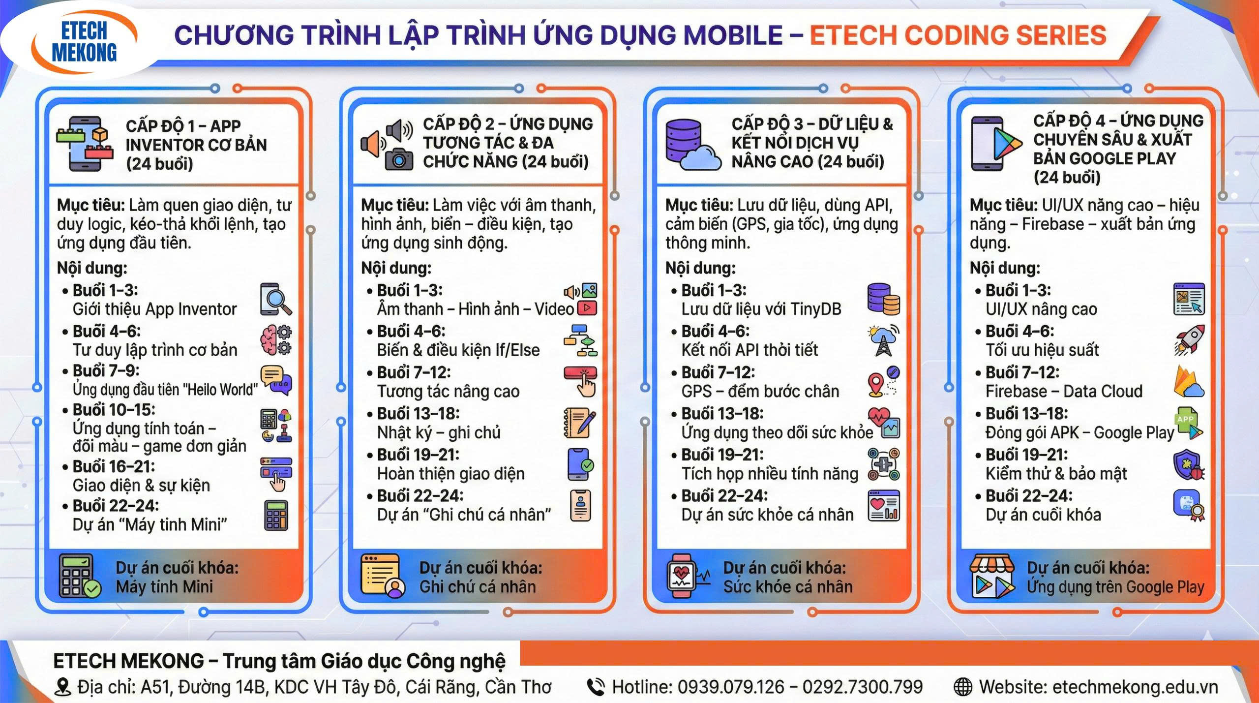 Là trung tâm đi đầu trong lĩnh vực giáo dục công nghệ (EdTech) tại khu vực Đồng bằng sông Cửu Long, ETECH MEKONG tự hào mang đến chương trình đào tạo lập trình di động bài bản, chuyên sâu và phù hợp với tâm lý lứa tuổi học sinh.