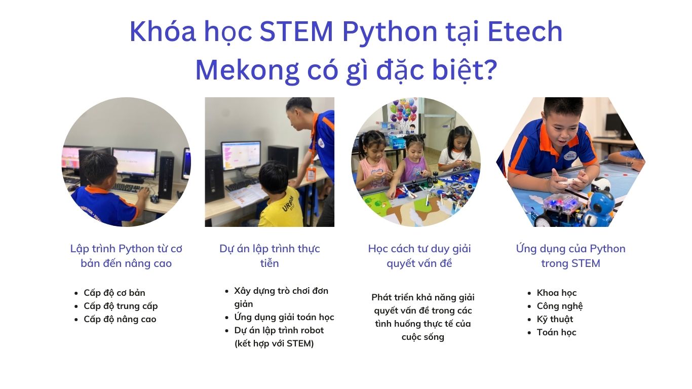 - Học STEM: Khóa học Python tại ETECH MEKONG kết hợp phương pháp STEM, phát triển kỹ năng về khoa học, công nghệ, kỹ thuật và toán học.