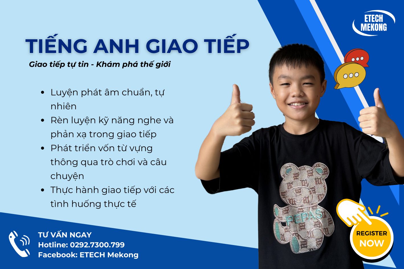 Khóa học “Tiếng Anh Giao Tiếp” tại ETECH MEKONG là sự lựa chọn tuyệt vời cho phụ huynh tại Cần Thơ mong muốn con em mình phát triển khả năng tiếng Anh một cách tự tin và hiệu quả. Với đội ngũ giáo viên chuyên nghiệp, phương pháp giảng dạy hiện đại và cơ sở vật chất tiên tiến, chúng tôi cam kết mang đến cho các em một môi trường học tập thân thiện và chất lượng, giúp các em vươn xa trên con đường học vấn và cuộc sống.