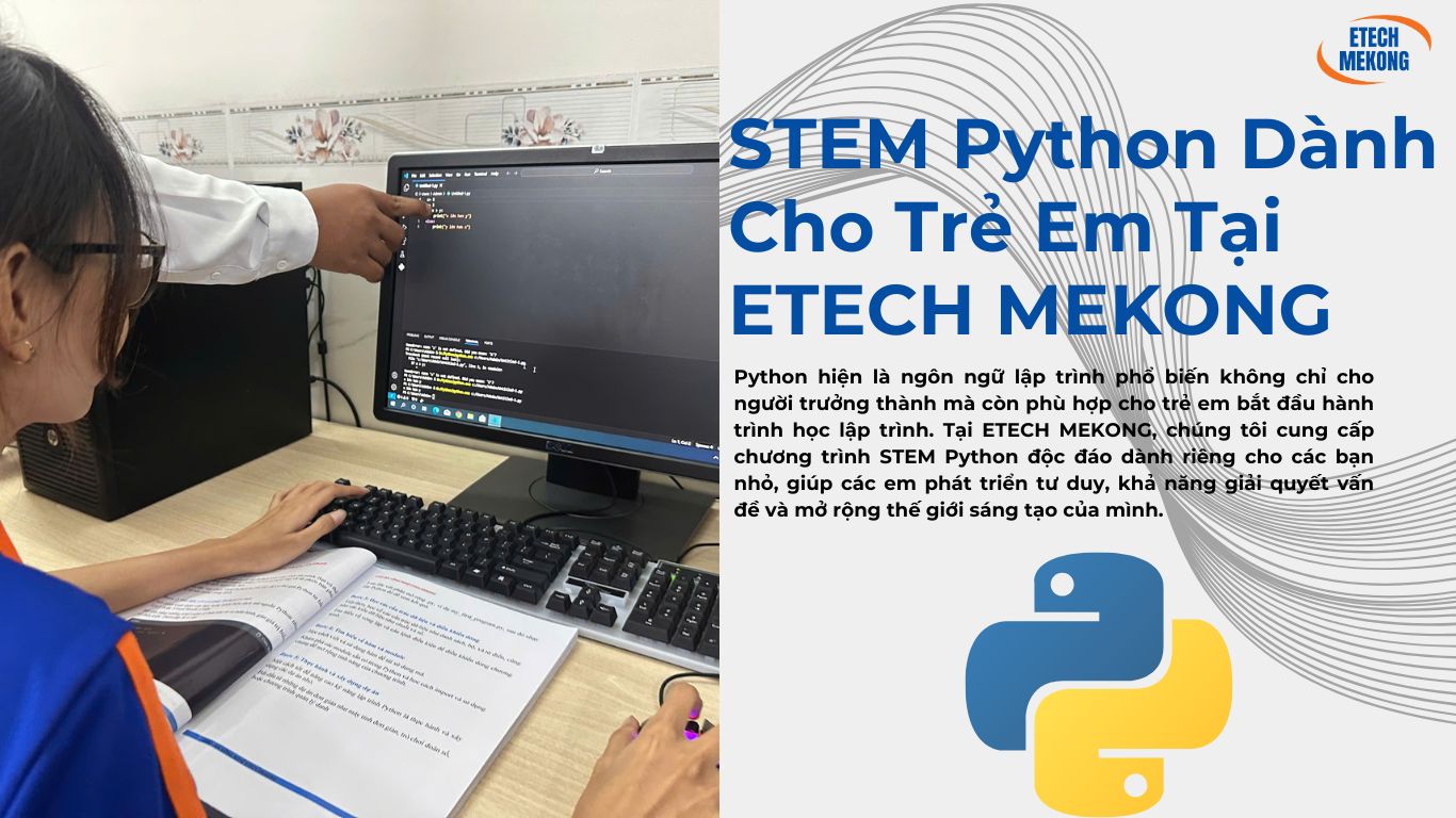 Python hiện là ngôn ngữ lập trình phổ biến không chỉ cho người trưởng thành mà còn phù hợp cho trẻ em bắt đầu hành trình học lập trình. Tại ETECH MEKONG, chúng tôi cung cấp chương trình STEM Python độc đáo dành riêng cho các bạn nhỏ, giúp các em phát triển tư duy, khả năng giải quyết vấn đề và mở rộng thế giới sáng tạo của mình.